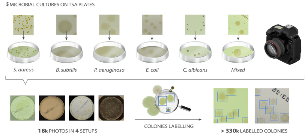 Preparing our own set of samples with photos of microbes was necessary because such a big and varied dataset did not exist in the publicly available collection. Although many researchers [2-5] have been concerned with the classification and counting of microorganisms, the number of provided images is definitely too small to optimize the parameters of the complicated neural network, such as object detector. In addition, mainly microscopic photos [2] or only small segments of agar plate culture [3-5] were made available.