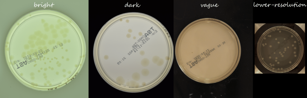 The AGAR is an image dataset for microorganism colonies detection and counting. This set contains 18k photos of Peri dishes taken by two cameras, under diverse lighting conditions, from very bright images to even more vague. We distinguish 4 acquisition setups as provided in Figure 2. The images are manually labeled by professional microbiologists using a bounding box and class tag to train and evaluate object detection algorithms. It contains in total 336 442 annotated colonies of five microorganisms (Staphylococcus aureus, Bacillus subtilis, Pseudomonas aeruginosa, Escherichia coli, and Candida albicans) most commonly used according to the Pharmacopoeia guidelines [6]. In addition, some defects (i.e. marks on agar surface) and contaminations (any unwanted microbiological contamination) were also labeled. AGAR database is not only photos of Petri dishes covered with countable (more than zero and less than 300 colonies) numbers of microbial colonies. The database also includes empty, and uncountable samples.