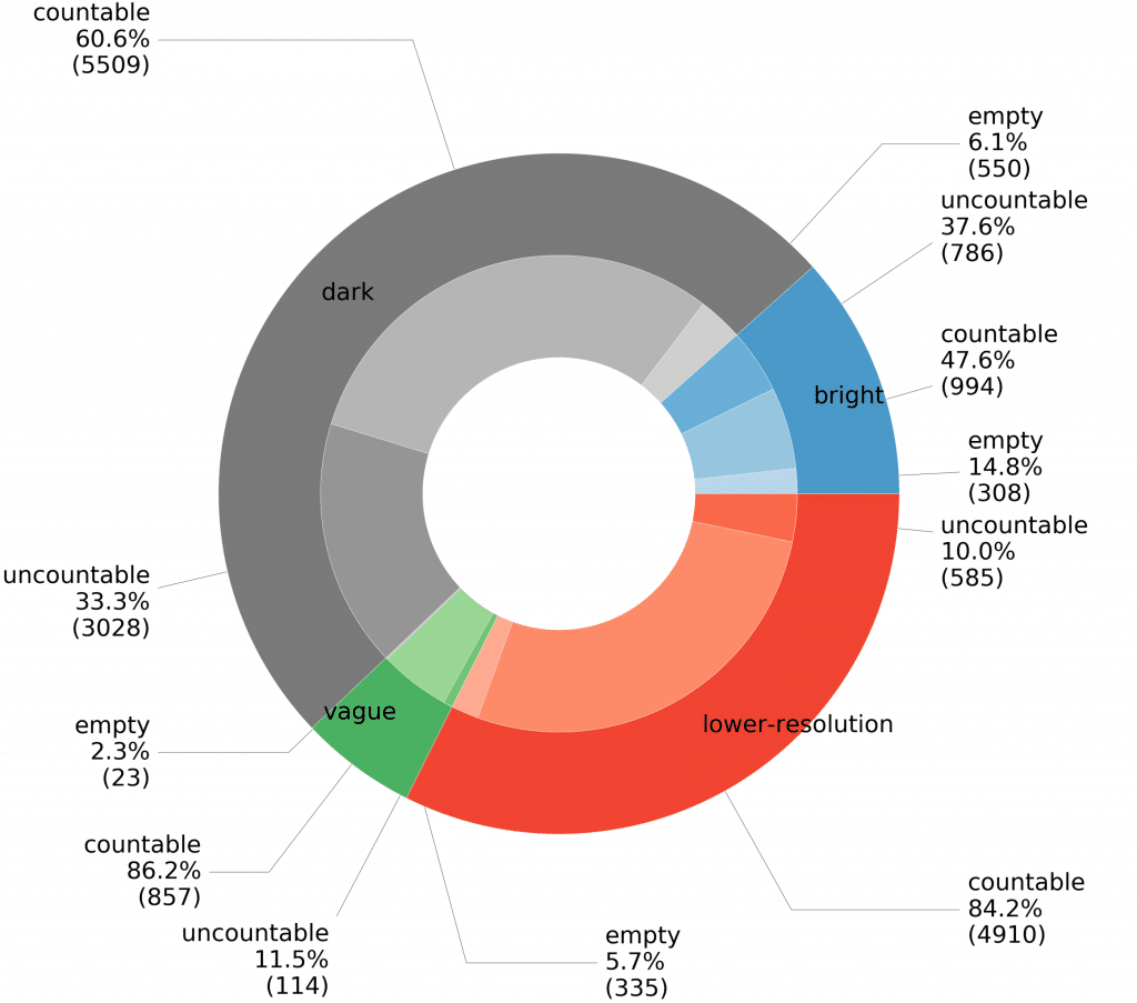 A summary for our datasets showing the proportion of images grouped by background category is shown in Figure 4. Different shades for subgroups in the given background category indicates samples classified by experts as empty, countable, and uncountable. At the very beginning of the data collection process, we collected photos obtained with a higher resolution camera (bright + dark + vague, see Fig. 2). In this part we have chosen a low level of dilution to significantly reduce the number of empty samples, and therefore uncountable probes account for more than 33% of this part of our collection.