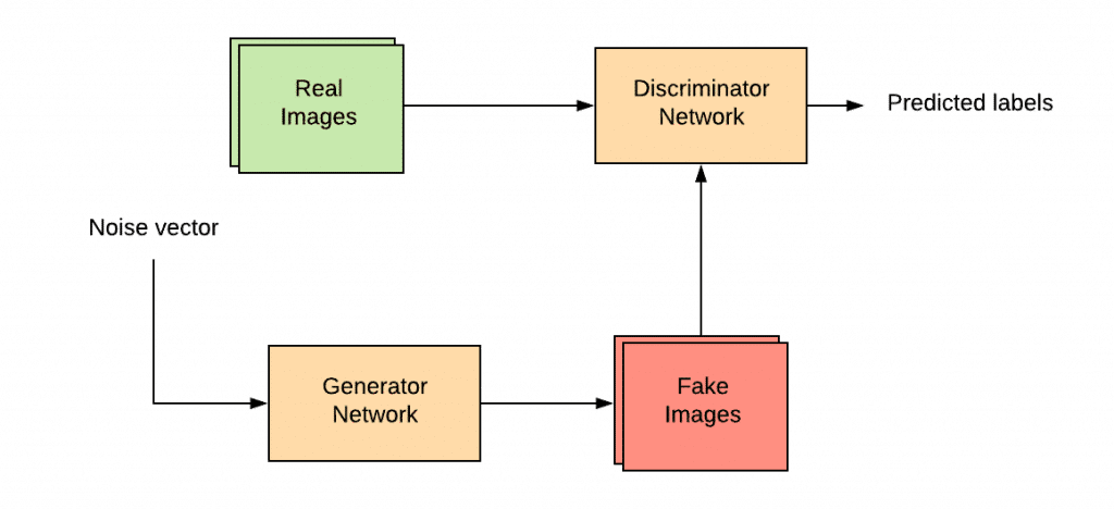 GAN consists of two neural networks competing against each other (hence the word “adversarial”). One network, called generator, generates new instances of data, for example images. The second network, called discriminator, evaluates them, i.e. it decides whether the instance belongs to the original training set or have been generated by the generator. The goal of the discriminator is to correctly recognize fake and authentic data instances while the generator aims at creating data instances, that will be deemed authentic by the discriminator. The hope is that during training both networks will get better and better, with the end result being a generator that produces realistic data instances.