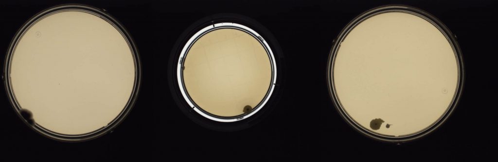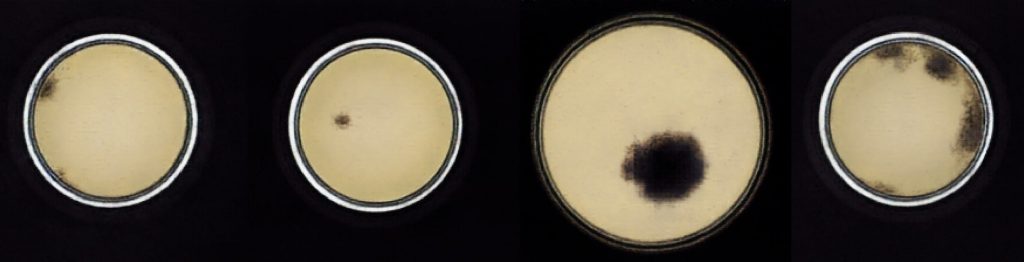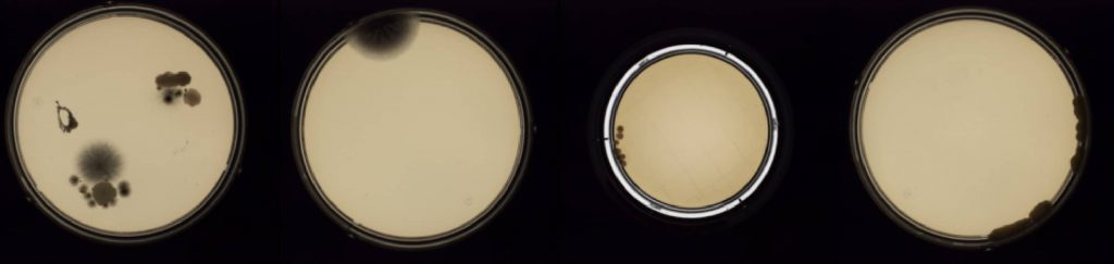 As stated above, at NeuroSYS we applied GANs to produce fake images of bacteria and fungi in Petri dishes. We aimed at creating samples that we lacked in the original set, namely images with only few, small organisms located near the edges of the dish. Below we present some generated images and compare them with original ones. Specifically we used a variation of standard GANs called Improved Wasserstein GANs [2, 3].