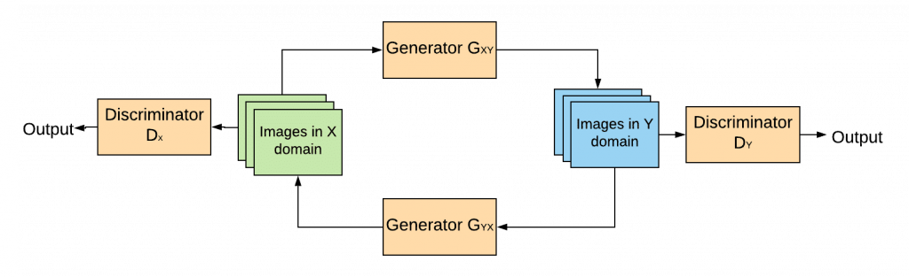 In order to train CycleGAN two sets of training data are needed, one set of images in domain X and the different set in domain Y. For example, the first set can contain photos of various landscapes and the other paintings of a certain artist. The goal is to learn to translate between the two domains, or in other words, to make photos look like paintings and vice versa. To do that CycleGAN uses two generators and two discriminators. One generatorGXY transforms images from domain X to Y and the other GYX converts images from Y domain to the X domain. Each generator has a corresponding discriminator DX and DY. As in standard GANs, discriminators try to correctly recognize fake and authentic data instances while generators aim at creating data instances, that will be deemed authentic by the discriminators.