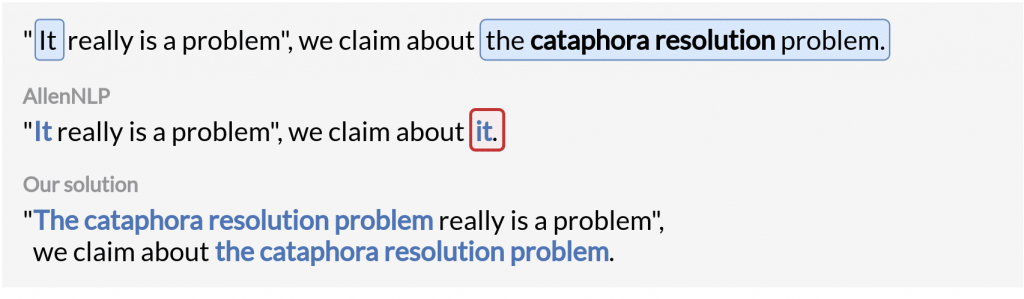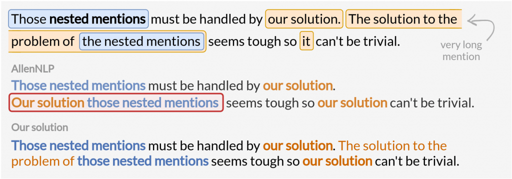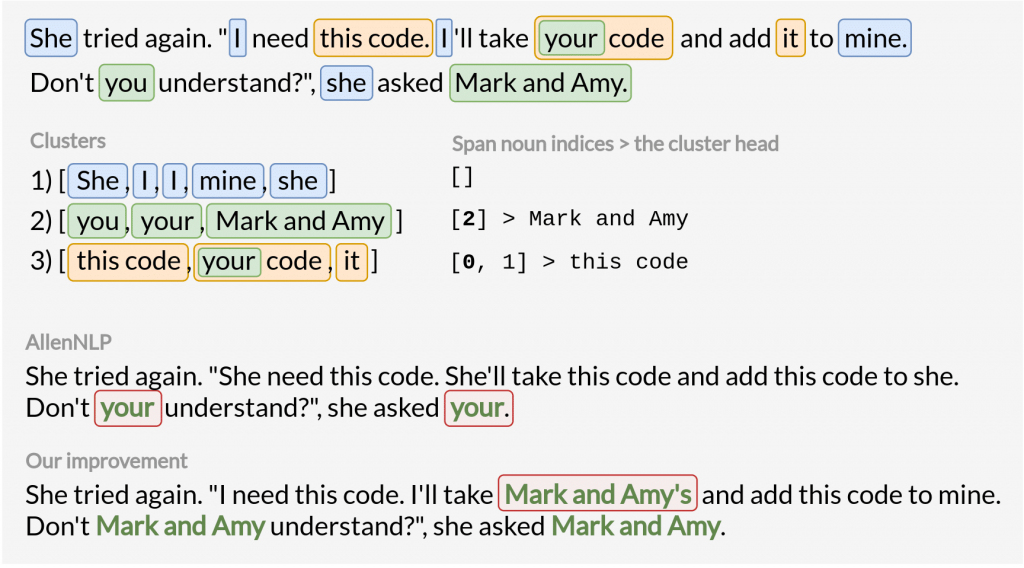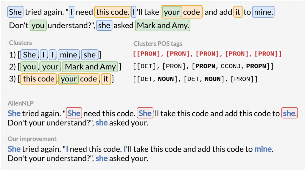 This made us think that there might be something we can do about it. We’ve decided to implement several minor changes that result in a significant improvement of the final text. As AllenNLP seems to find more clusters, which are often better, we settled on a solution that focuses more on this model.