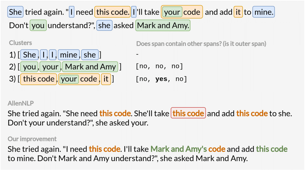 In order to modify AllenNLP’s behavior, we focus on the coref_resolved(text) method. It iterates through all clusters and replaces all spans in every cluster with the first found mention. Our improvements concern only this function and the nested methods inside it.