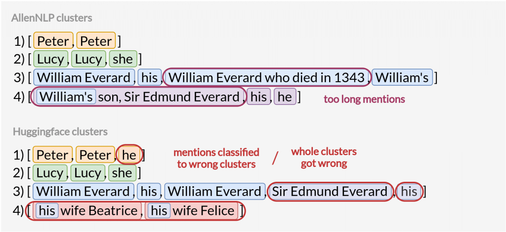 To efficiently compare proposed intersection strategies, it’s easier to think of models’ outputs as sets of clusters, like the ones illustrated below. It’s worth noting that AllenNLP and Huggingface not only found slightly different mentions but also whole clusters.