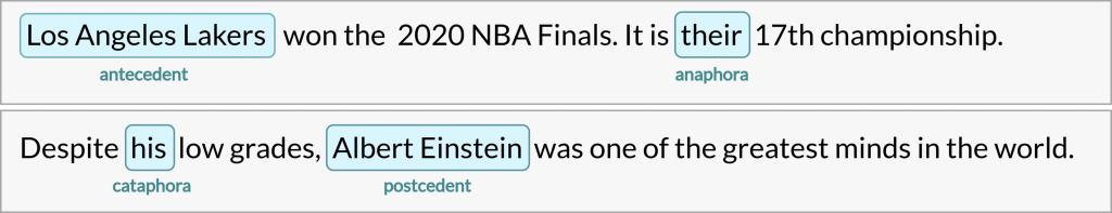 It’s always best to visualize an idea and provide a concrete example as opposed to just theorizing about a topic. What’s more, we’ll try to explain and give concrete examples of the most common terms, associated with coreference resolution that we may come across in articles and papers.