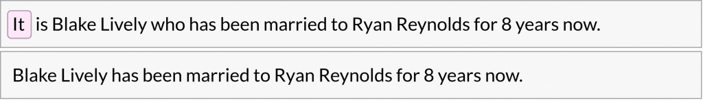 As we can see [his, he, him] and [it] have been replaced with the real-world entities, from the corresponding groups – “Sam” and “a white star” respectively. As a result, we obtained a text without any pronouns while still being valid grammatically and semantically.