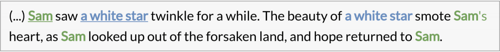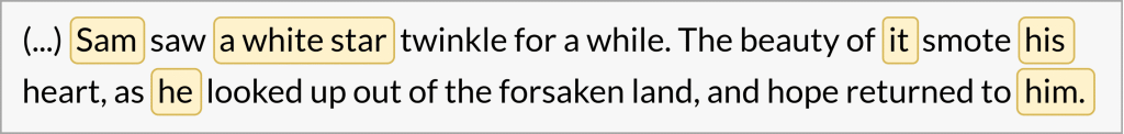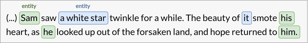 The resulting groups are [Sam, his, he, him] as well as [a white star, it]. Notice that “Sam” and “a white star” are marked as entities. This is a crucial step in coreference resolution. We need to not only identify similar spans but also determine which one of them is, often referred to as, the real-world entity.