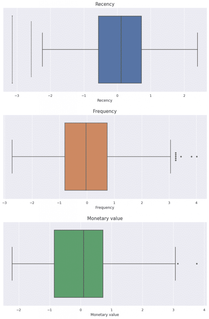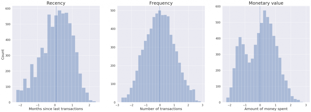 We can observe that recency distribution is skewed. Moreover, features have different means and variances. So first, we need to unskew data by implementing the log transformation on the recency column. Then, we standardize data, so all features have mean equals zero and the standard deviation equals one.