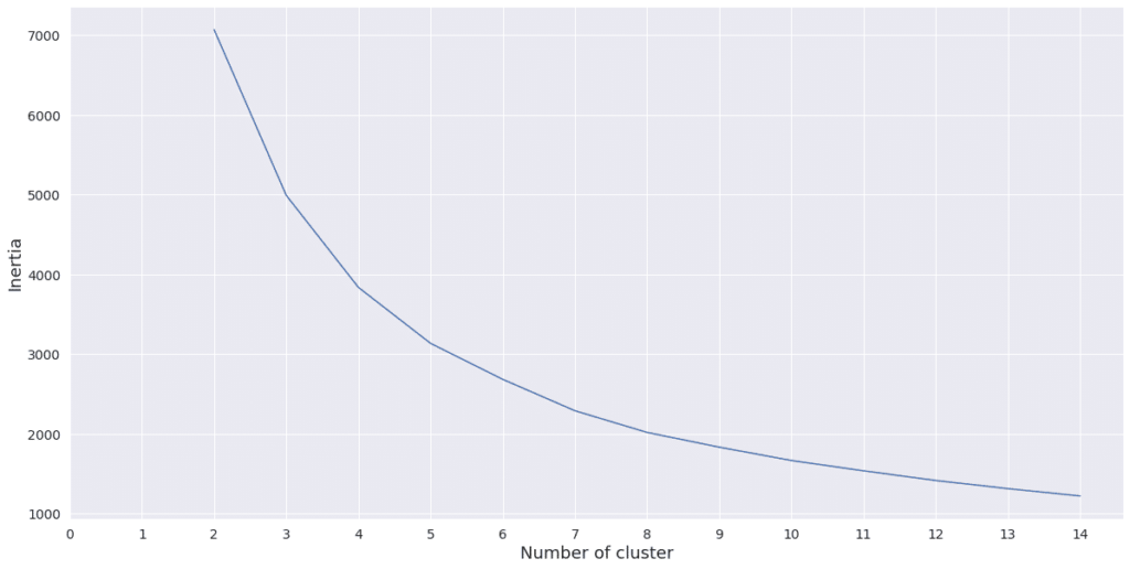 First, we need to perform k-means clustering for a range of values for k. Then for each value of k, the average score for all clusters is calculated. As the scoring metric, we used inertia, which is the sum of the distances from each data point to its assigned cluster centroid. Next, we plot inertia versus k and looked for the ‘elbow’ point (the point at which decrease starts to slow down).