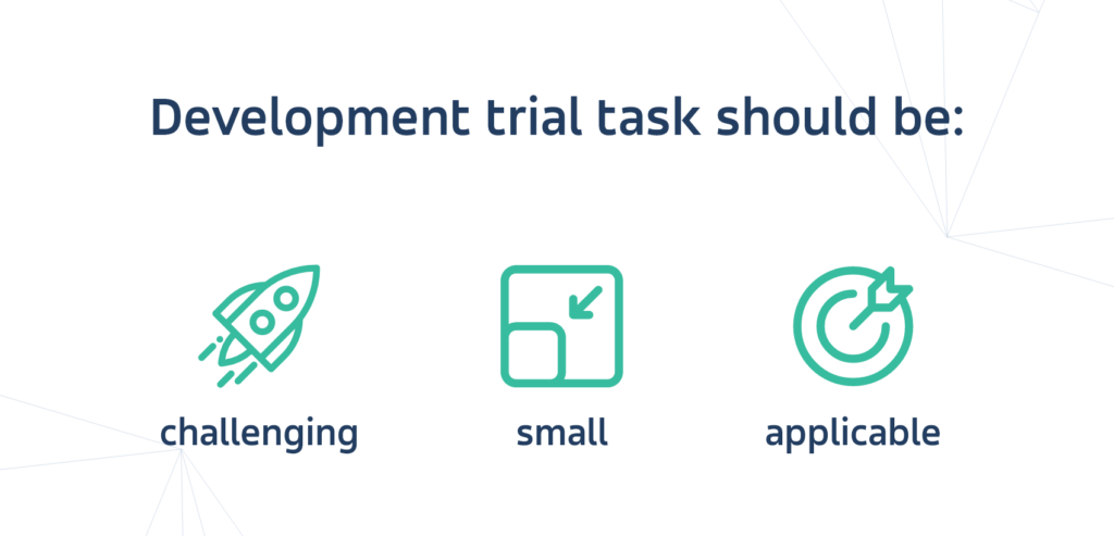 - Software development trial. Ideally, after a round of interviews, you feel who’d be the best fit. Now it’s time for them for the baptism of fire!