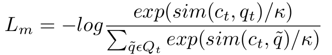 The letter κ is a temperature which is constant during training. Sim stands for cosine similarity. The main part of function Lm is similar to softmax but instead of scores we take cosine similarities between context representation ct and quantized representations q. For easier optimization we also put -log on that fraction.