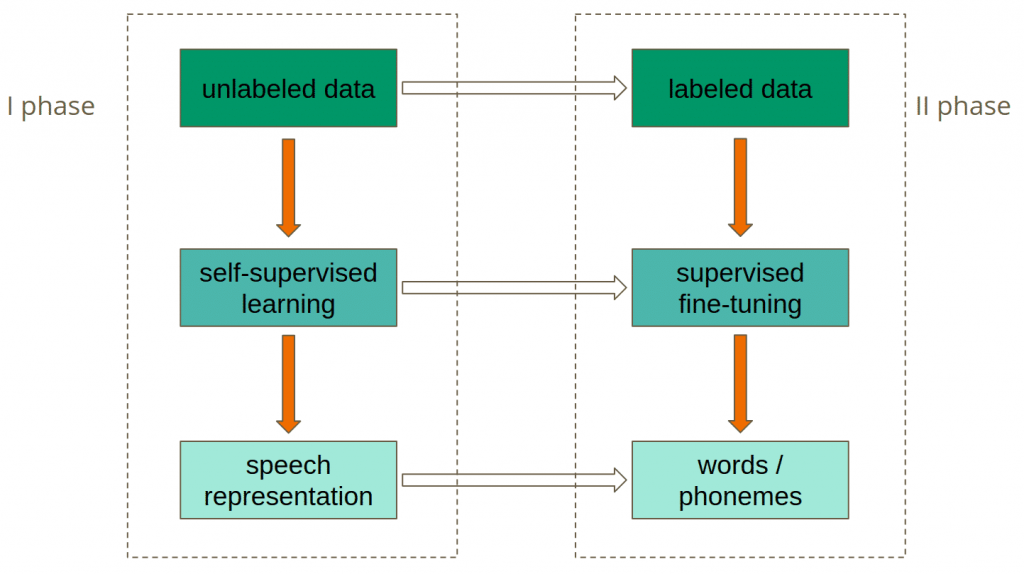 As presented in the picture below, the model is trained in two phases. The first phase is in a self-supervised mode, which is done using unlabeled data and it aims to achieve the best speech representation possible. You can think about that in a similar way as you think of word embeddings. Word embeddings also aim to achieve the best representation of natural language. The main difference is that Wav2Vec 2.0 processes audio instead of text. The second phase of training is supervised fine-tuning, during which labeled data is used to teach the model to predict particular words or phonemes. If you are not familiar with the word ‘phoneme’, you can think about it as the smallest possible unit of sound in a particular language, usually represented by one or two letters.