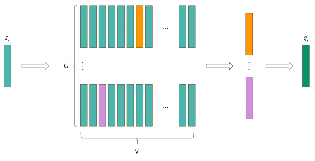But how can we implement this in automatic speech recognition? Let’s assume that one latent speech representation vector zt covers two phonemes. The number of phonemes in a language is finite. Moreover, the number of all possible pairs of phonemes is finite. It means they can be perfectly represented by the same latent speech representation. Furthermore, the number of them is finite, so we can create a codebook containing all possible pairs of phonemes. Then, the quantization comes down to choosing the right code word from the codebook. However, you can imagine that the number of all possible sounds is huge. To make it easier to train and use, the authors of Wav2Vec 2.0 created G codebooks, each one consisting of V code words. To create a quantized representation, the best word from every codebook should be selected. Then, the chosen vectors are concatenated and processed with a linear transformation to obtain a quantized representation. The process is presented in Figure 5.